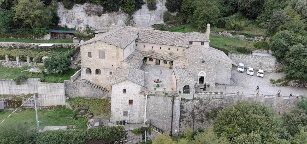 Il complesso, gravido di un profondo senso di pace, comprende l’Eremo originario, fondato dai Benedettini intorno al Mille, il convento voluto da San Bernardino da Siena in memoria del fondatore dell’Ordine francescano e gli ambienti risalenti al periodo in cui Francesco dimorò in questo sito, costruiti accanto alla grotta dove il Santo si ritirava per pregare in solitudine. Questa grotta divenuta sacra identifica il Santuario, tanto da portarne il nome. Francesco, accompagnato da alcuni dei suoi frati, arrivò all’Eremo di Sant’Urbano nel 1213; la piccola comunità iniziò a riunirsi per lodare il Signore nel piccolo oratorio di San Silvestro, edificato dai monaci benedettini nell’XI secolo.
