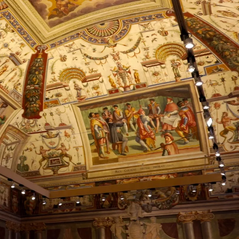 The inside halls maintained their richness with cycles of frescoes attributed to the Flemish painter Karel Van Mander, retouched and partly reinterpreted during restoration, which is why part of the original picture has been lost.