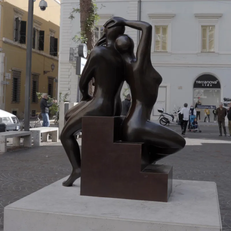 Shying away from mere descriptive and anecdotal intentions, Kostabi did not want to represent but to signify: he eternalizes the essence of the embrace between two lovers. The protagonists of the sculptural group are not in fact two individuals characterized by precise anatomical-physiognomic details, they are the typical figures that distinguish the artist's stylistic signature. These figures are defined through elegant stylisation and formal synthesis, where the soft volumes and harmony of masses and curved lines are enhanced in the highly polished surfaces caressed by light. Influence from figurative suggestions drawn from the iconographic repertoire of past art and underground culture are at the origin of Mark Kostabi's research: for example, the reinterpretation of certain metaphysical outcomes revisited in a postmodern key, with clear pop accents. (Francesco Santaniello)